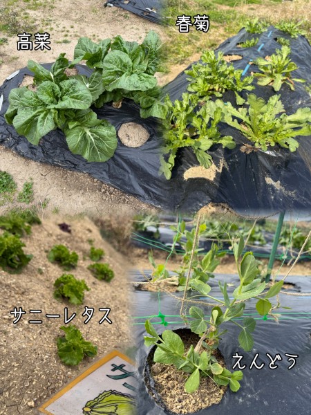 EMIRAIZの畑の近所の方が高菜・春菊・サニーレタス・えんどうの苗をくださり、EMIRAIZの畑にみんなで植えていました。