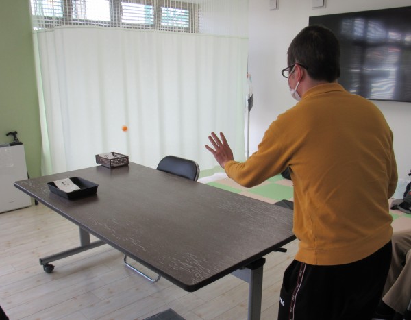 今日の午後からのレクリエーションでは、ピンポン玉シュートをしています。